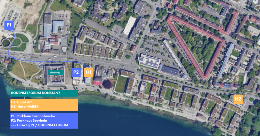 Mit dem Auto: Sie erreichen Konstanz und das Bodenseeforum ohne Problem mit dem Auto aus Deutschland über die A81 oder A96, aus der Schweiz über die A4 oder A7 und aus Österreich über die A14 (via CH).
